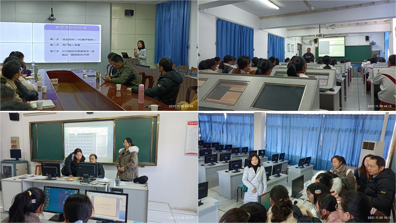 上午,研习师生参加了高中信息技术组集体备课活动,教导处副主任、信息中心主任何钧军,信息技术教师俞婷、欧阳涛、石晓熹、陆飞等出席,活动由全国信息技术优质课比赛最高等级奖获得者蒋丰老师主持。欧阳老师向研习师生介绍了石化一中的校园安防系统,演示了部分功能和操作,强调了信息技术教师在校园信息化建设中发挥的重要作用。接着,俞老师采用无生授课方式,以“算法及其描述”为主题,为研习师生奉献了一场非常精彩的示范教学。她由解密游戏引出算法的基本概念、基本特点,进而围绕该游戏的设计非常具体生动地讲述了算法描述的三种方法、程序设计的三种结构。与会师生都认为,教学设计巧妙,并且大道至简,逻辑性强,知识点层层递进、深入浅出。随后,研习师生还就智慧教育、智慧课堂、课堂管理、教学设计等问题与石化一中信息技术教师进行了深入交流。