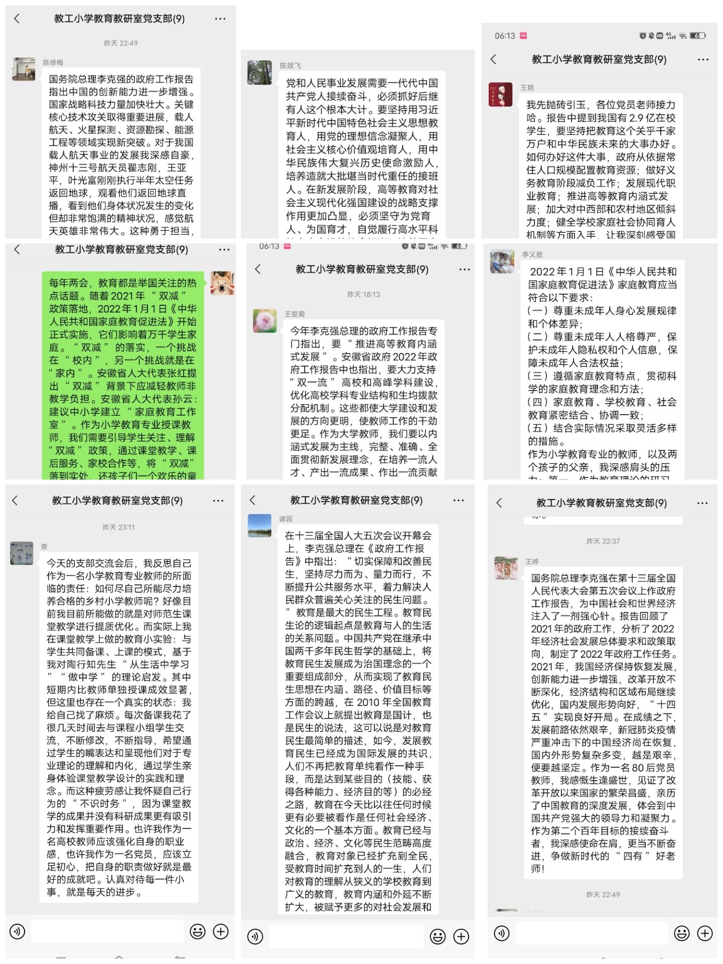 会上,全体教师党员一起学习了国务院总理李克强在第十三届全国人大五次会议上作的工作报告、全国政协主席汪洋在十三届全国政协五次会议上作的工作报告,以及安徽省委副书记、省长王清宪在省十三届五次会议上作的工作报告。各位教师党员重点关注全国、全省“两会”报告中关于教育的重要论述,纷纷结合当前防疫形势和工作实际,就乡村教育发展、小学教育专业建设改革、“双减”政策、《家庭教育促进法》、校园欺凌、大学生心理健康等相关热点问题进行了交流和讨论。教师党员们的讨论聚焦热点,紧密结合教育教学实践,在面对新形势和新任务时,大家能够深刻认识到高校教育工作者的责任,明确目标,充满信心,在教学与研究工作中勇于担当、开拓创新。
