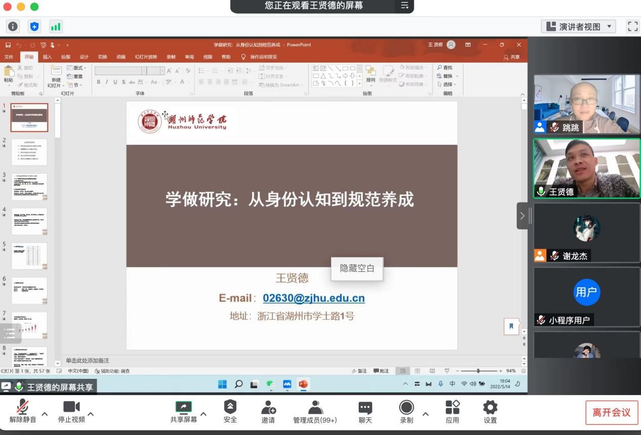 5月14日晚,初等教育系品牌学术活动“红色园丁大讲坛”开展了杰出校友系列讲座的第二讲,本次讲座邀请了beat365优秀毕业生,湖州师范学院教师教育学院王贤德博士做了题为《学做研究:从身份认知到规范养成》的学术报告,报告由初等教育系主任诸园教授主持,小学教育专业近300名本科生和硕士研究生线上聆听了报告。