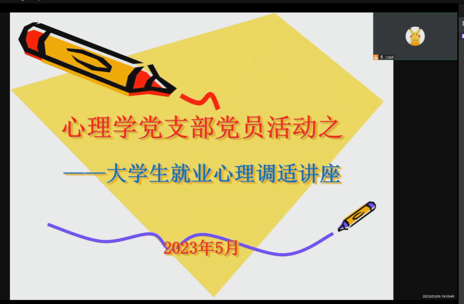为发挥党员的先锋模范作用,以实际行动践行“我为群众办实事”,心理学党支部于5月6日晚7点开展了线上“毕业生就业心理调适”主题讲座。讲座由心理学党支部江瑞辰老师主讲。教师教育学院与电子工程与智能制造学院部分毕业生参与了讲座。