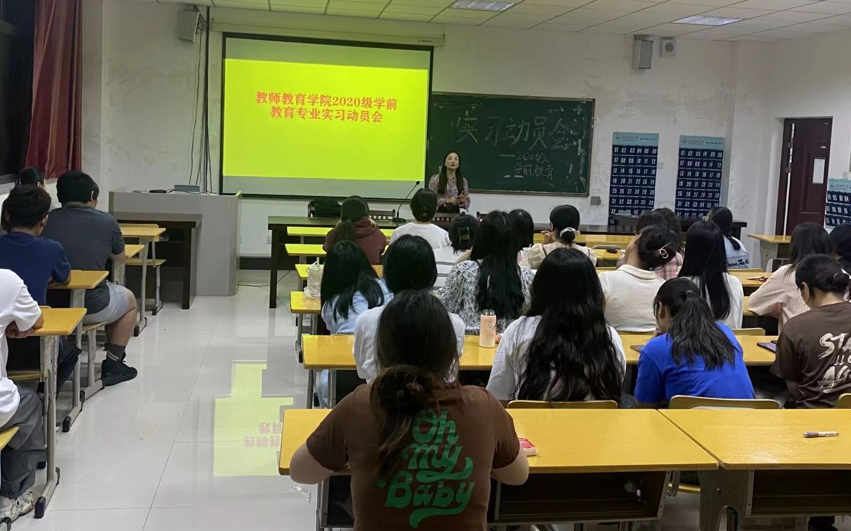 为积极引导2024届学前教育专业毕业生做好教育实习前的各项准备,推进教育实习工作的顺利开展,2023年9月25日晚,beat3652020级学前教育实习生在J305教室召开教育实习动员大会。学前教育专业负责人高向东、墨子巷幼儿园园长杨俊梅及学前教育教研室教师谢红玉参与了本次实习动员大会。