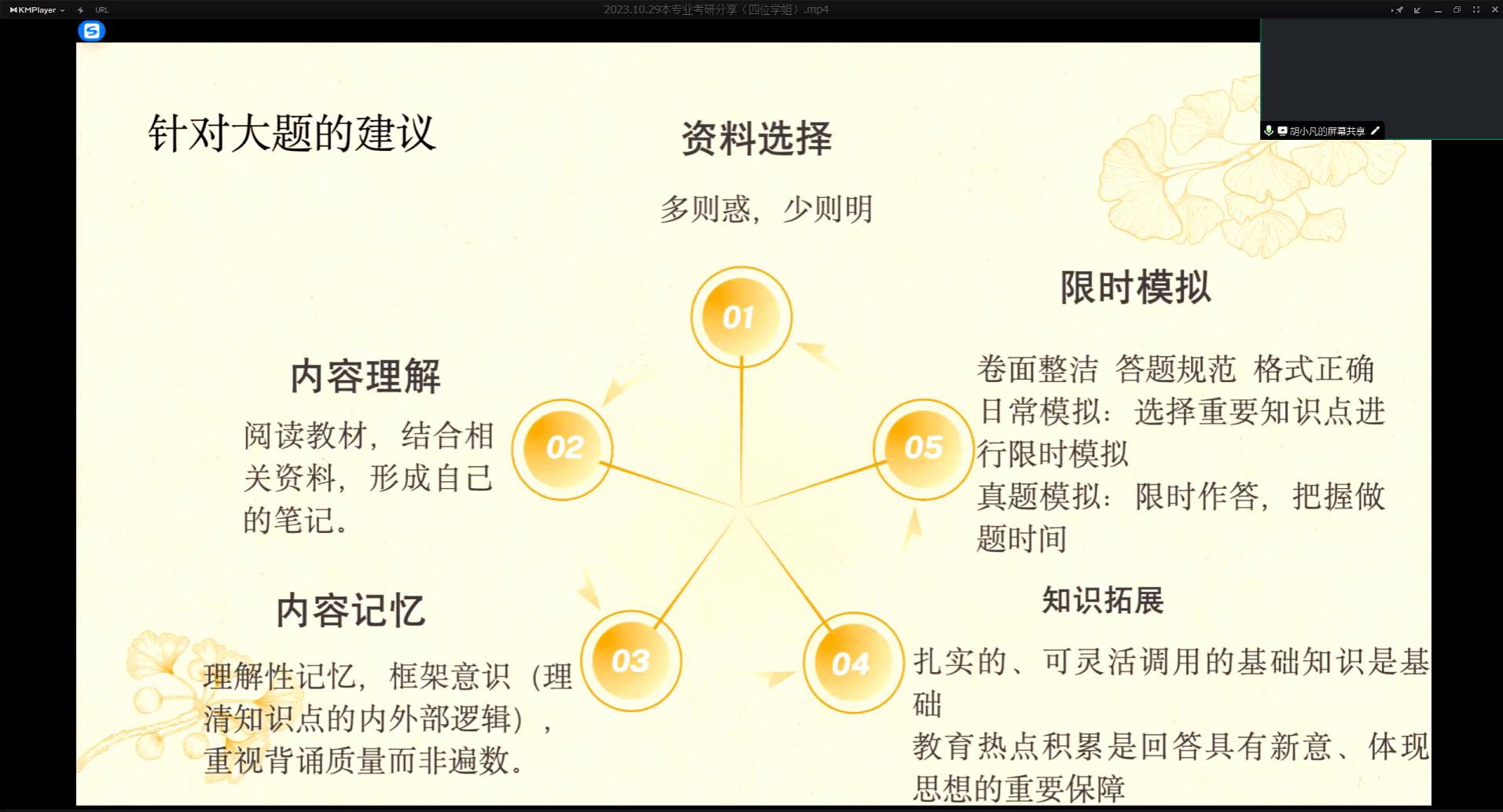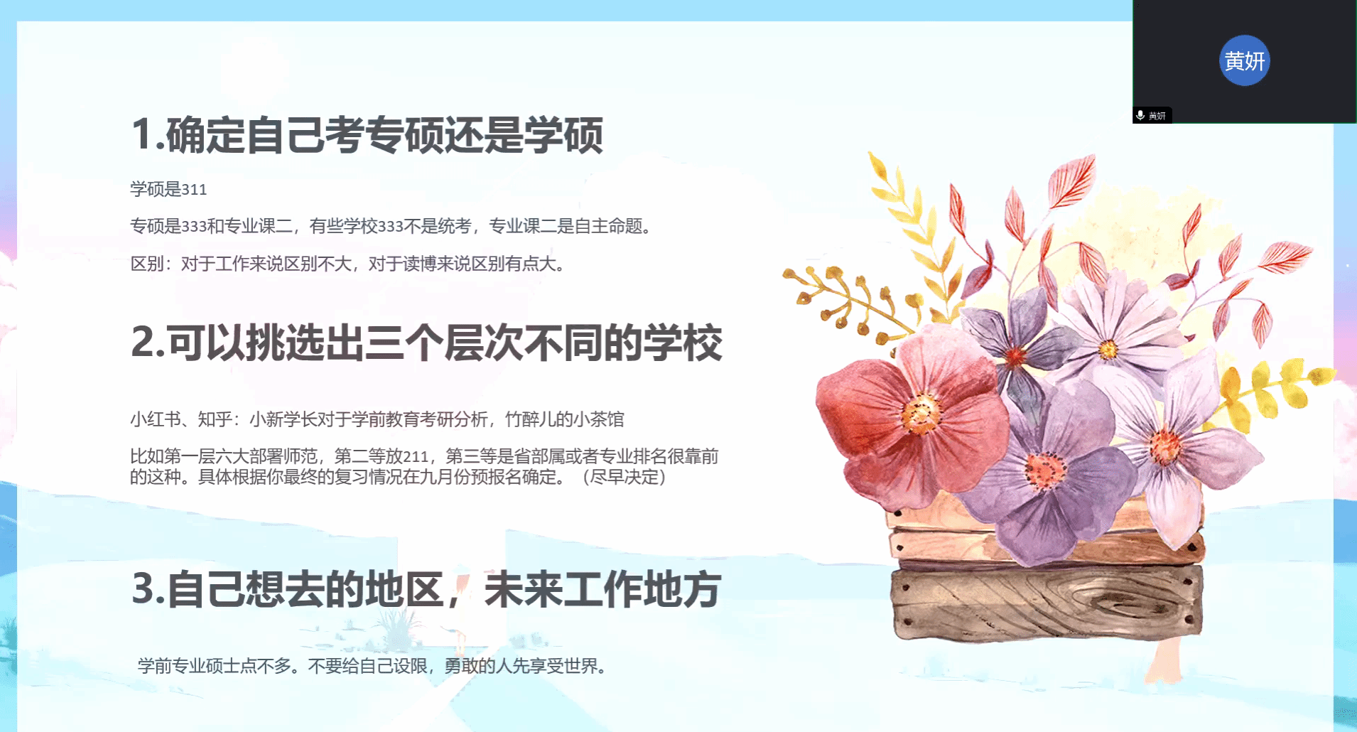 四位学姐的分享干货十足,每人都精心准备了PPT,她们围绕院校选择、考研科目学习、支教与实习、考研网课与参考资料选择等进行了详细介绍,用简明易懂的语言将考研经验娓娓道来,让同学们对考研相关事项有了非常全面的认识。