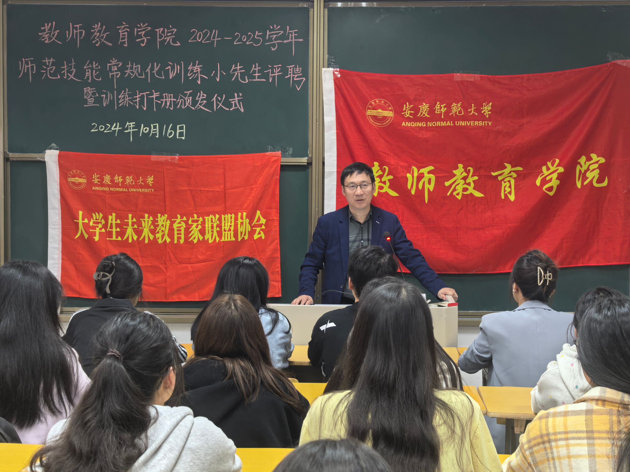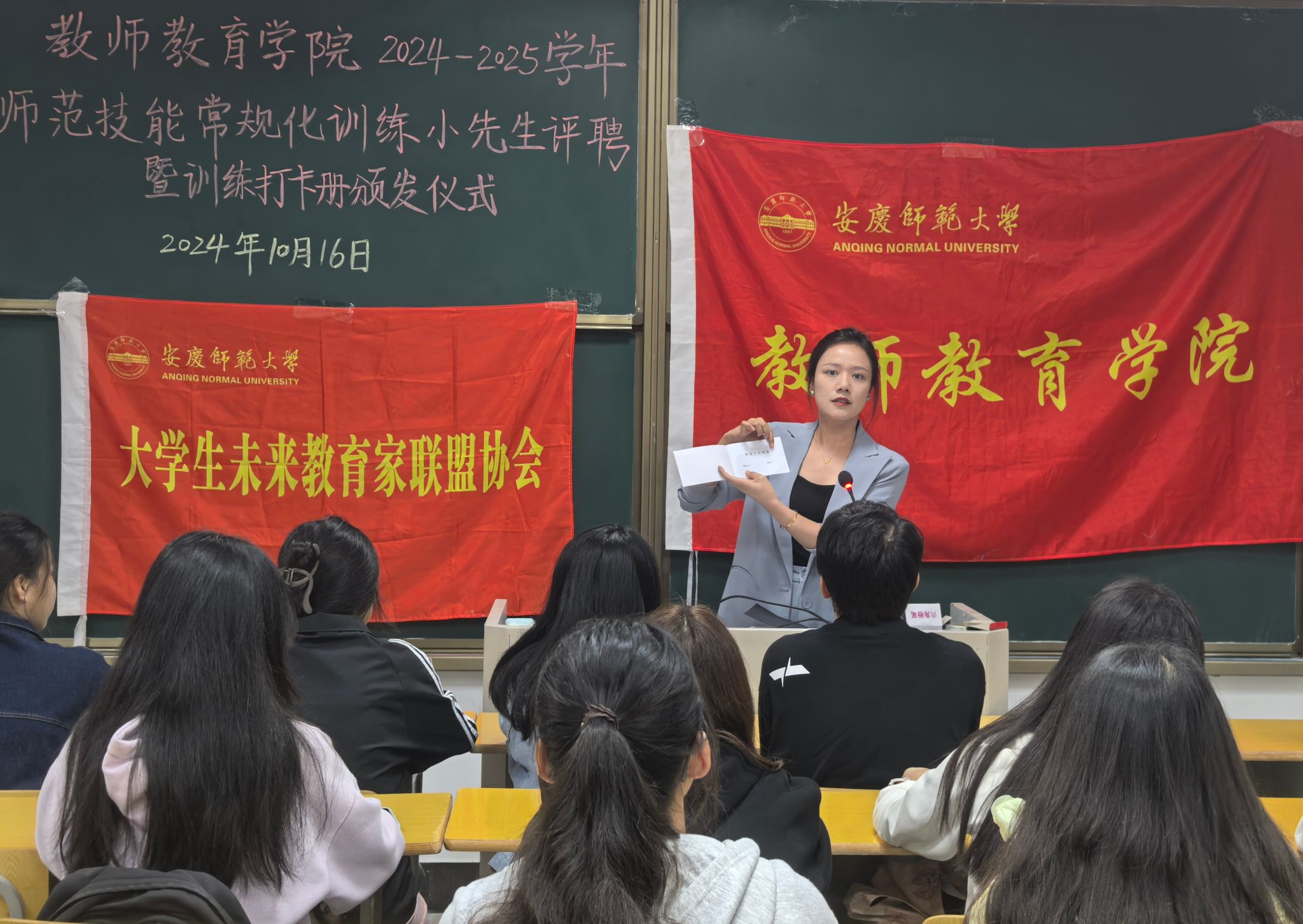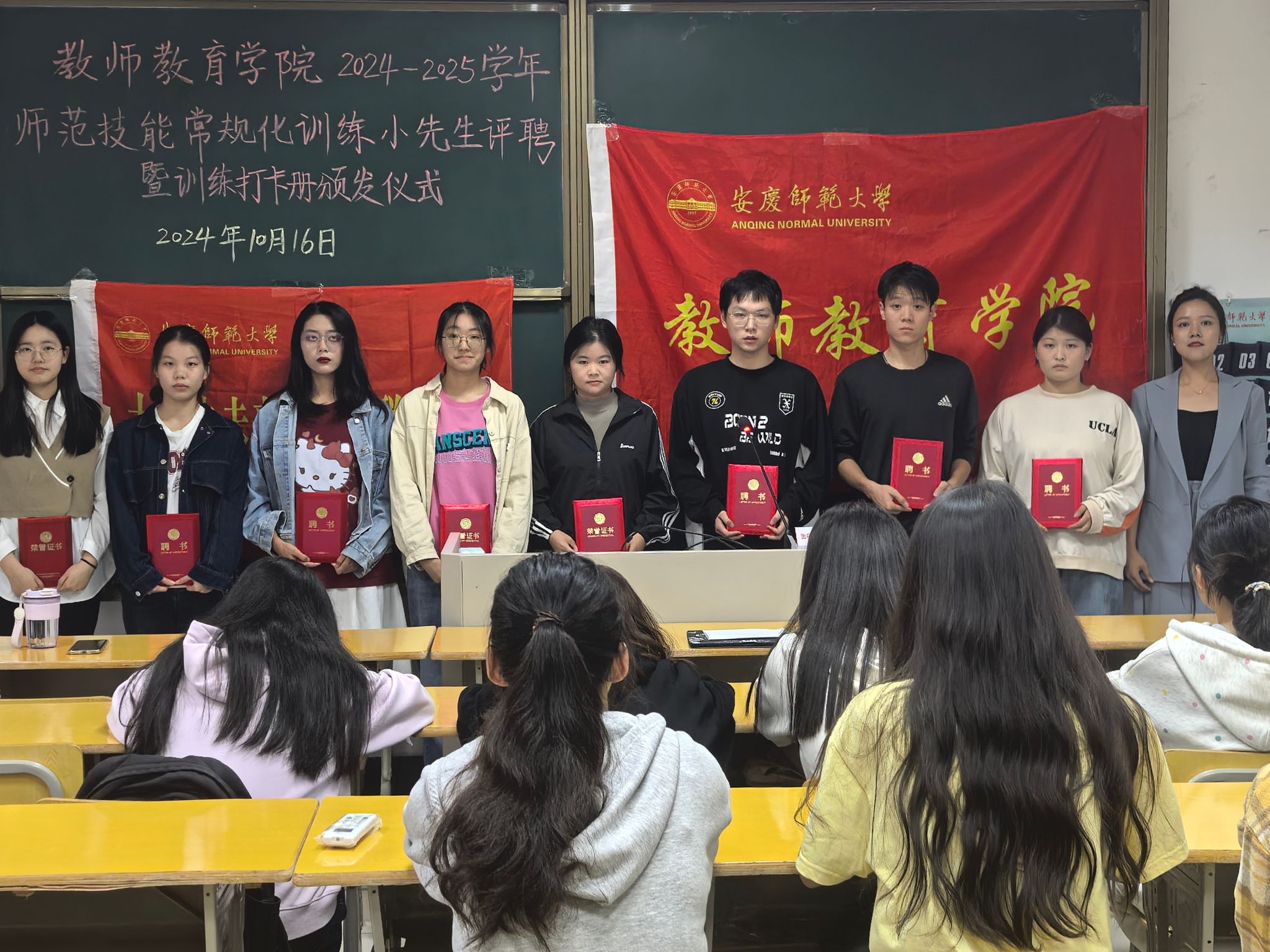 10月16日,beat365于J104教室开展2024-2025学年师范生技能常态化训练“小先生”评聘暨训练打卡册颁发仪式。院党委副书记许世平、院团委副书记姚强诚、新聘任20余名“小先生”及2024级新生班委到场参加。活动由大学生未来教育家协会会长王睿主持。