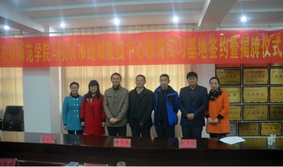 值第24个国际残疾人日之际,12月3日下午,安庆师范学院教育学院与安庆市残联康复中心教育实习基地签约暨揭牌仪式在安庆市残联举行。教育学院院长曹长德,特殊教育专业教研主任郭启华,教师赵子刚及部分特教专业学生出席。安庆市残联党组书记、理事长童宏葵,康复科科长杨传斌,市残联康复中心主任叶小红,副主任王庆芳及康复中心教师出席签约暨揭牌仪式。