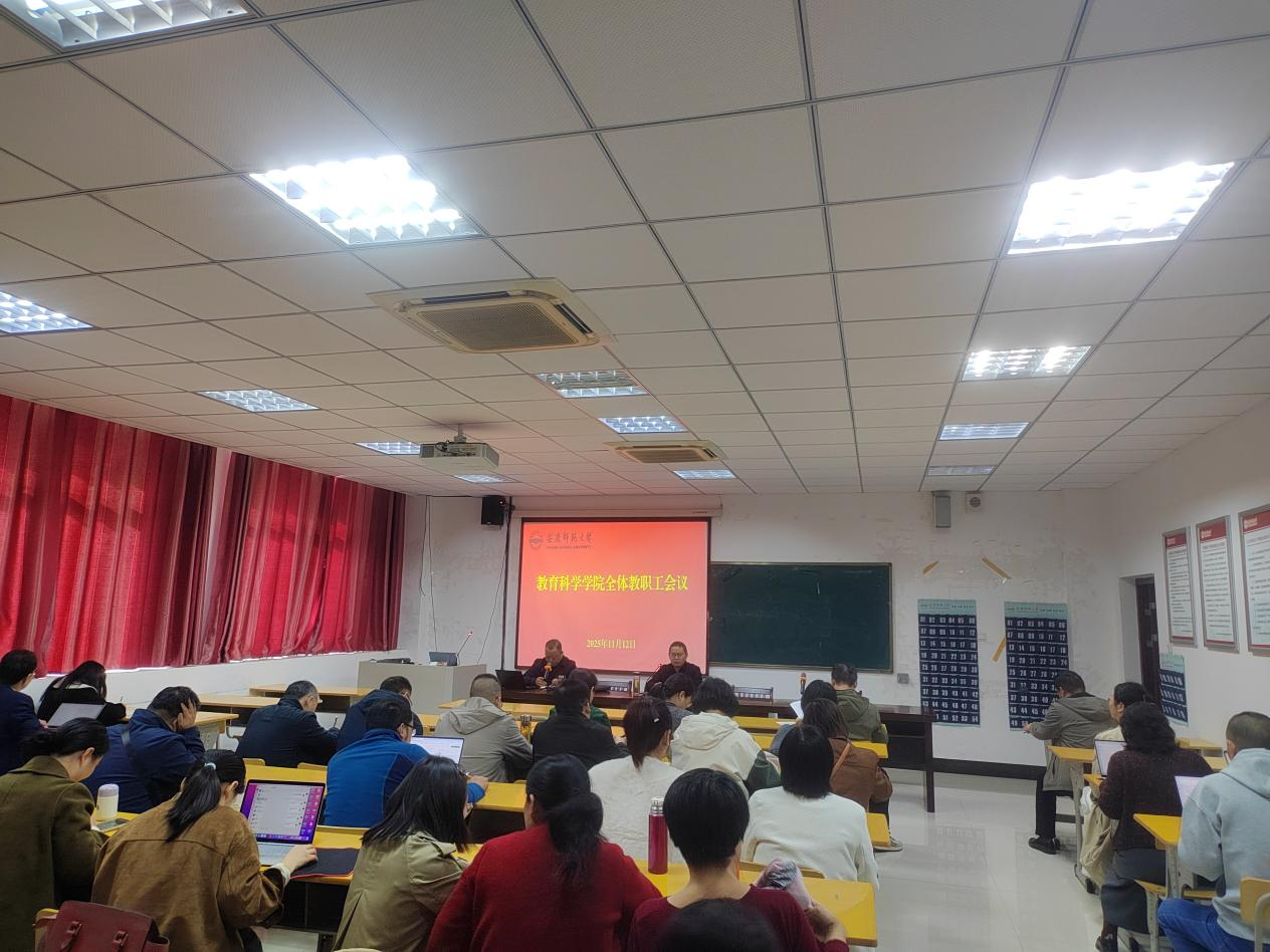 11月12日,beat365在线唯一官网登录在J305会议室召开全体教职工大会,学习宣传贯彻党的二十届四中全会精神,安排布置学院近期重点工作。会议由党委书记何孔蛟主持。