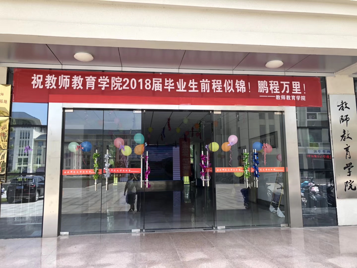 “一次欢庆”:6月26日,教师教育学院张灯结彩,积极布置教师教育学院大楼,横幅、气球、彩带,每一样东西都预示着这个日子不仅是别离的日子,同时也是教师教育学院每一位师生共同欢庆的日子,为毕业生离校营造了一个别样的节日气氛,