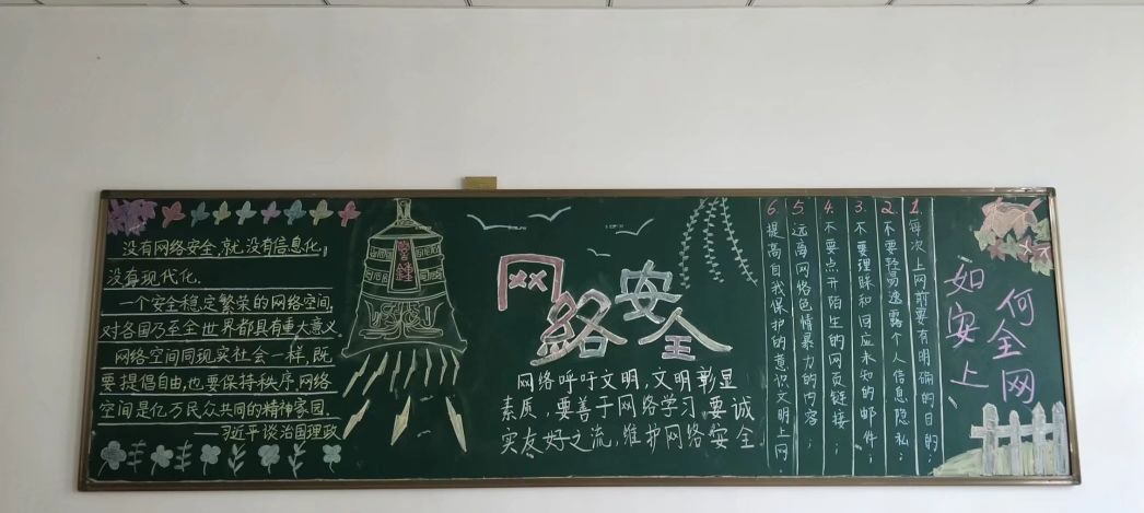 网络安全关系到民族的兴旺和国家的前途,树立网络安全意识,是全社会的任务,更是学校教育的一项重要内容之一。9月14日—9月25日,学院各班级围绕网络安全这一主题在各班负责教室绘画黑板报,同学们结合实际,大胆创作。将网络知识和教室文化充分结合。20日中午,学院主席团和网信部工作人员参与评选,评出表现出色的班级,并予以颁奖!