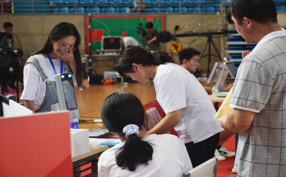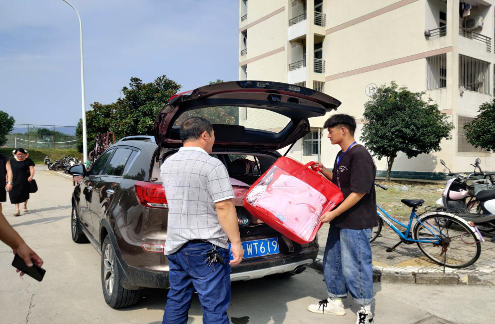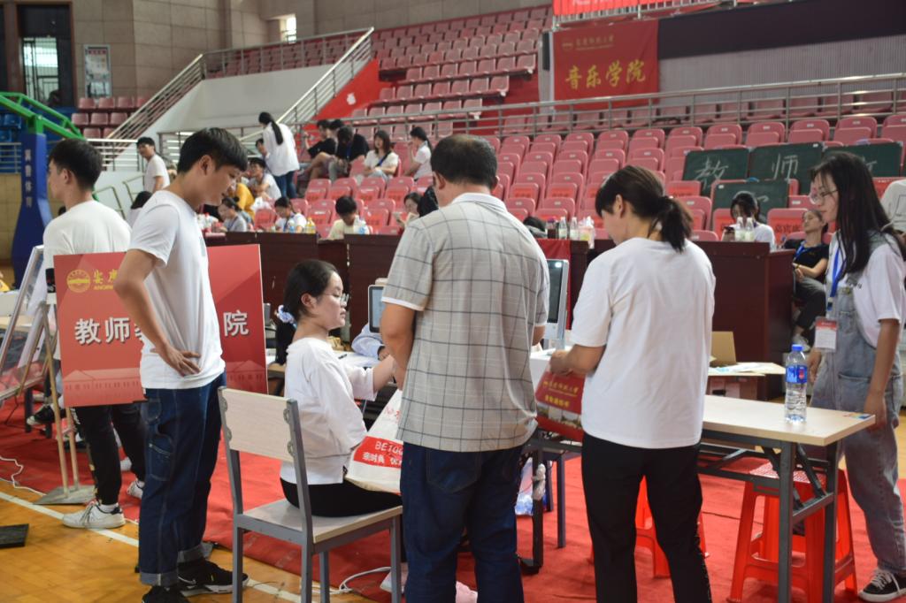随后,学院老师和志愿者陪同新生前往校南门体育馆办理入学登记和宿舍入住。