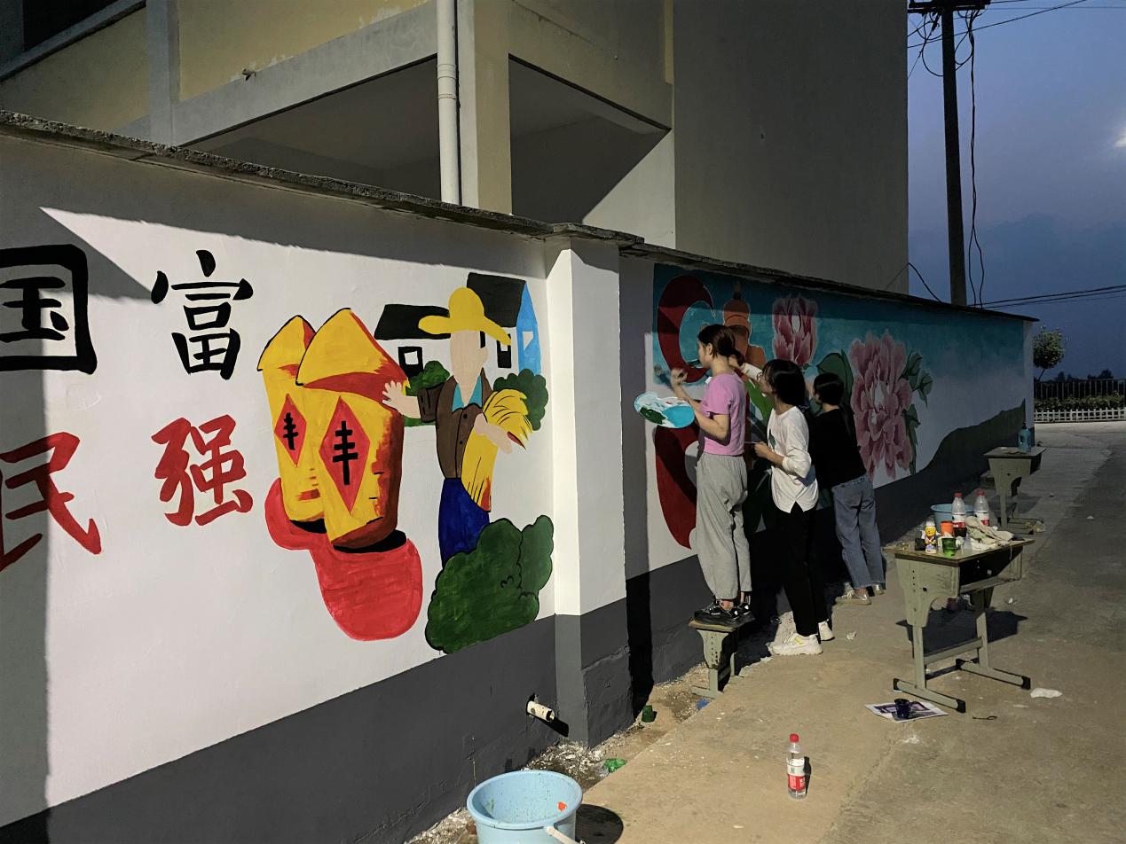 为了这次“大制作”,学生们下了不少功夫,光是颜料就准备了一大箱,加上调色盘、刷子和粉笔等绘画用品,塞满了两辆车的后备箱。“我们不光是简单地完成绘图,为了让它们效果更好,细节方面我们打磨了很长时间。”学前教育专业2018(2)班的王菁介绍,作为一名预备党员,自己更是要做好每一件事,为新农村的建设添一份力。