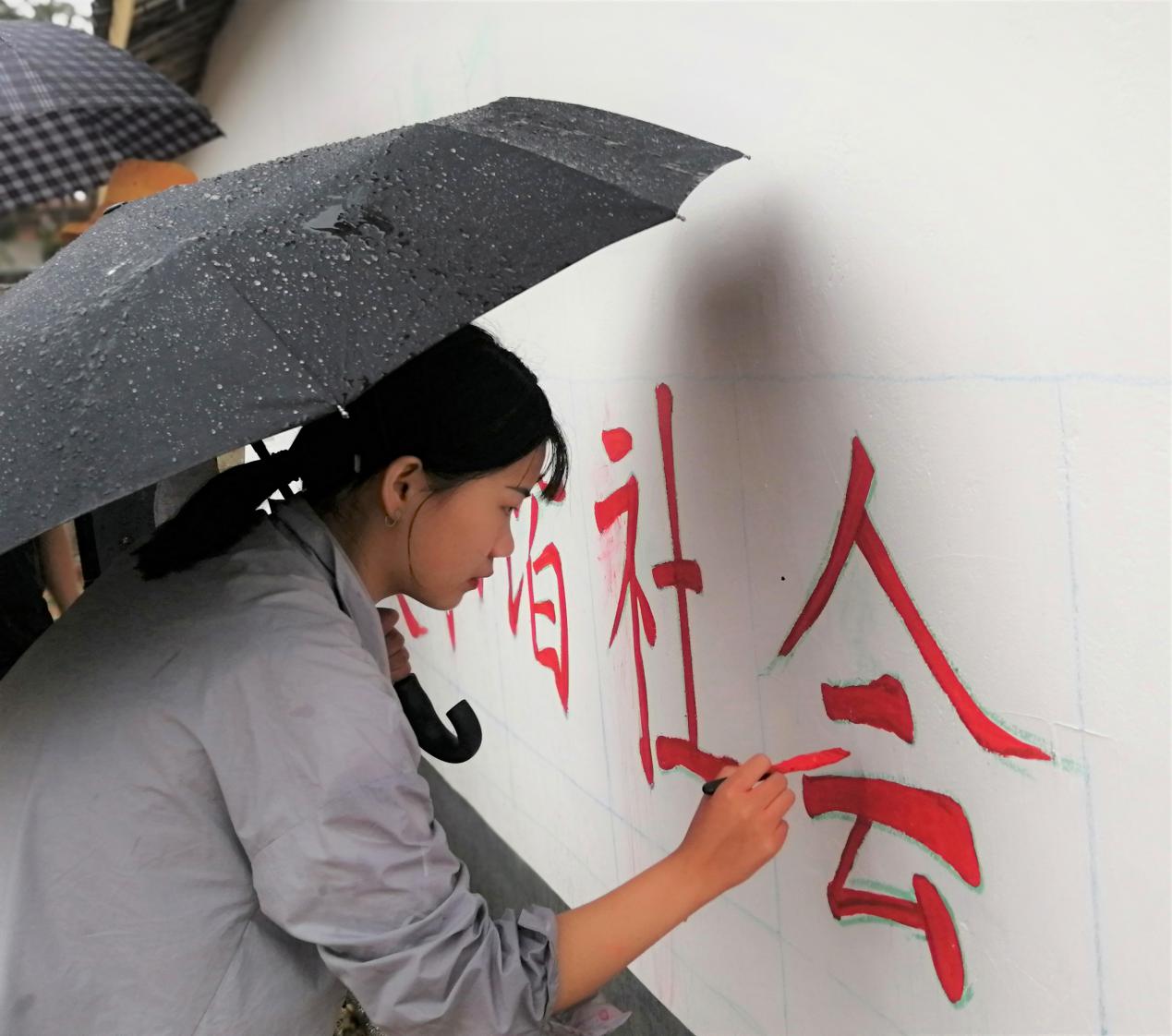 “早上6点半出发,晚上7、8点才能回学校”“中午没有午休时间,吃点便饭便回到墙边进行绘画”……谈到这三天学生的工作,章岭村的村民表示赞赏也很心疼,“但是,这几个女孩子挺能吃苦,都坚持了下来,而且完成得很不错。”负责与学生对接的陈先生十分欣慰,作为入党积极分子,这些女生都很好地践行了吃苦耐劳、乐于奉献的党员精神。