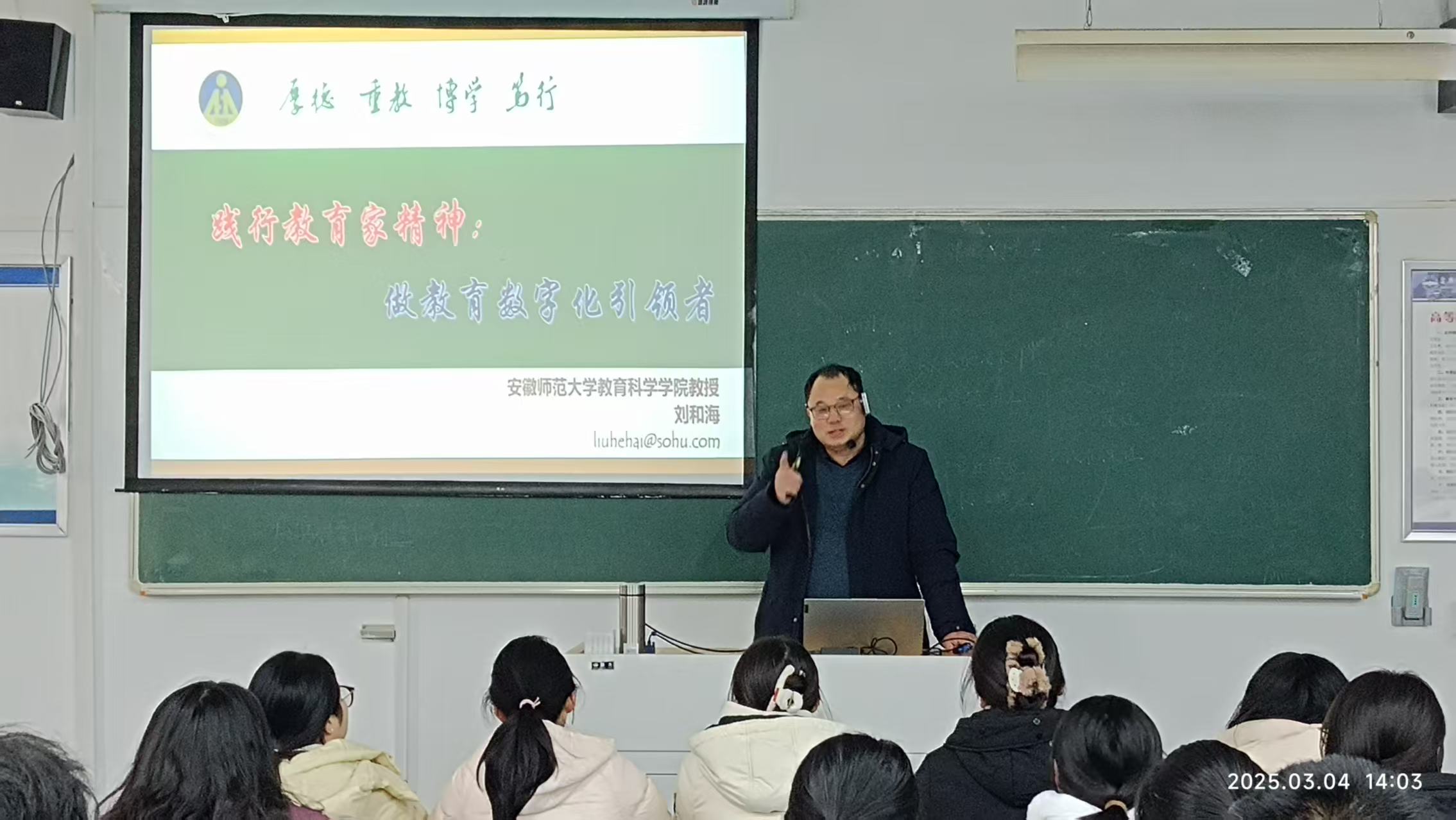2025年3月4日,安徽师范大学刘和海教授应邀做客红色园丁大讲坛,作题为“践行教育家精神:做教育数字化引领者”学术报告。beat365在线唯一官网登录部分专任教师、教育技术学专业本科生、研究生约90人参加报告会,会议由韦伟老师主持。