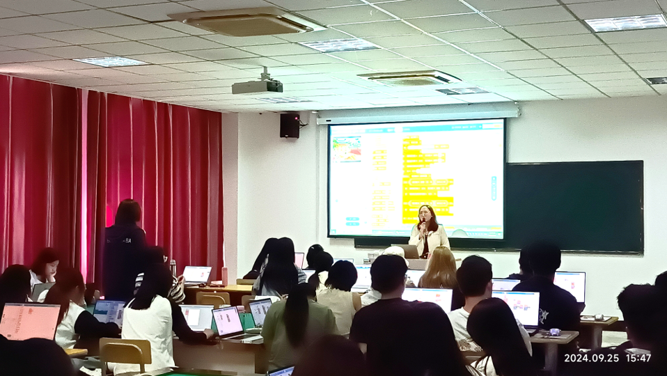 开班仪式后,何素凤从“切水果”“愤怒的小鸟”等游戏入手,讲述这些游戏的设计思路,重点讲解如何利用Scratch语言实现游戏中各种有意思的效果,引起了学生的极大兴趣。