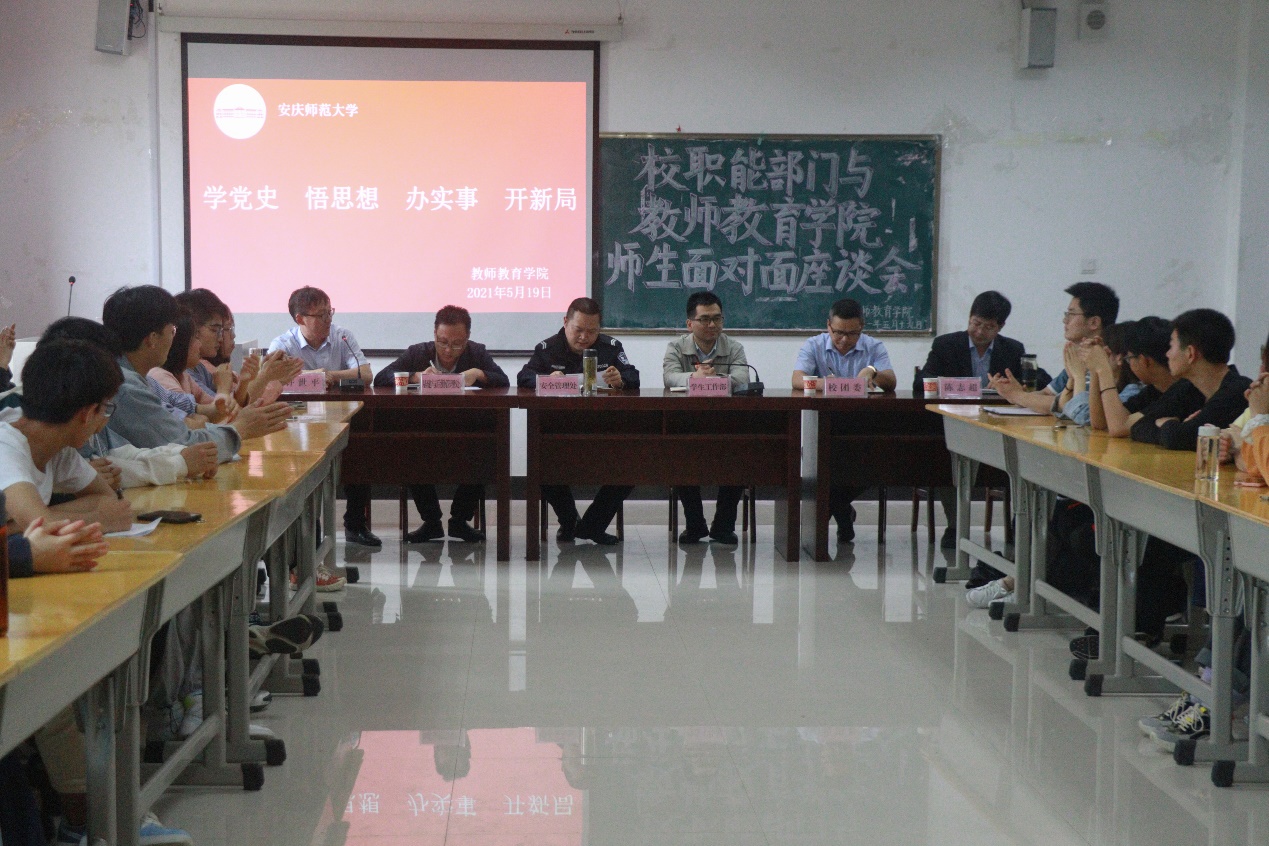 为推深做实党史学习教育,把党史学习教育同推动工作、解决实际问题结合起来,5月19日,教师教育学院召开学校职能部门负责人与学生代表面对面座谈会,及时帮助同学们解决在学习和生活中遇到的问题,开展好“我为群众办实事”实践活动。学生处处长夏建华、安全管理处处长徐华胜、校团委书记陈东、基建与后勤管理处科长李谋平应邀出席会议。