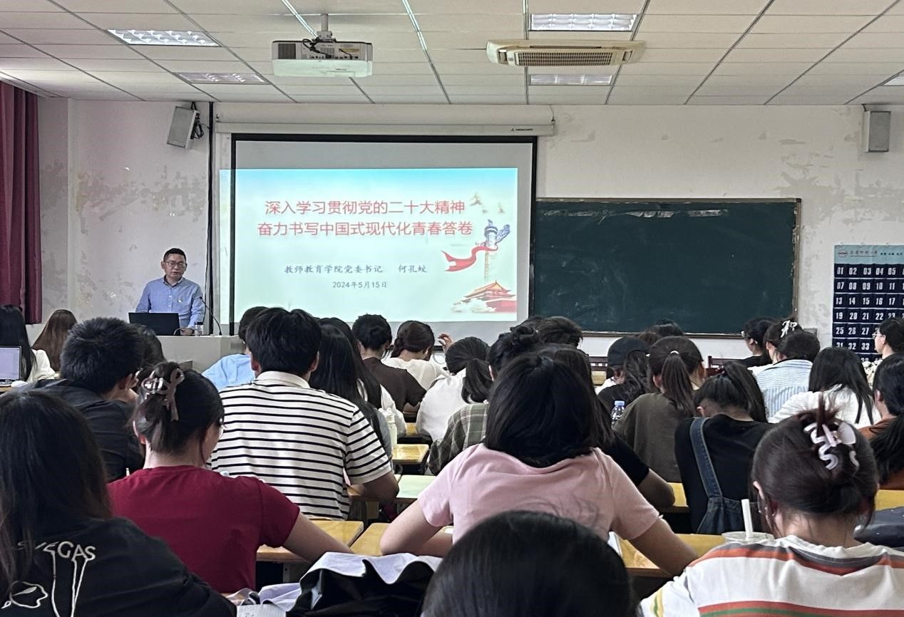 5月15日,beat365在J305教室开设《深入学习贯彻党的二十大精神,奋力书写中国式现代化青春答卷》专题党课。学院党委书记何孔蛟担任主讲人,全体第69期入党积极分子参加学习。