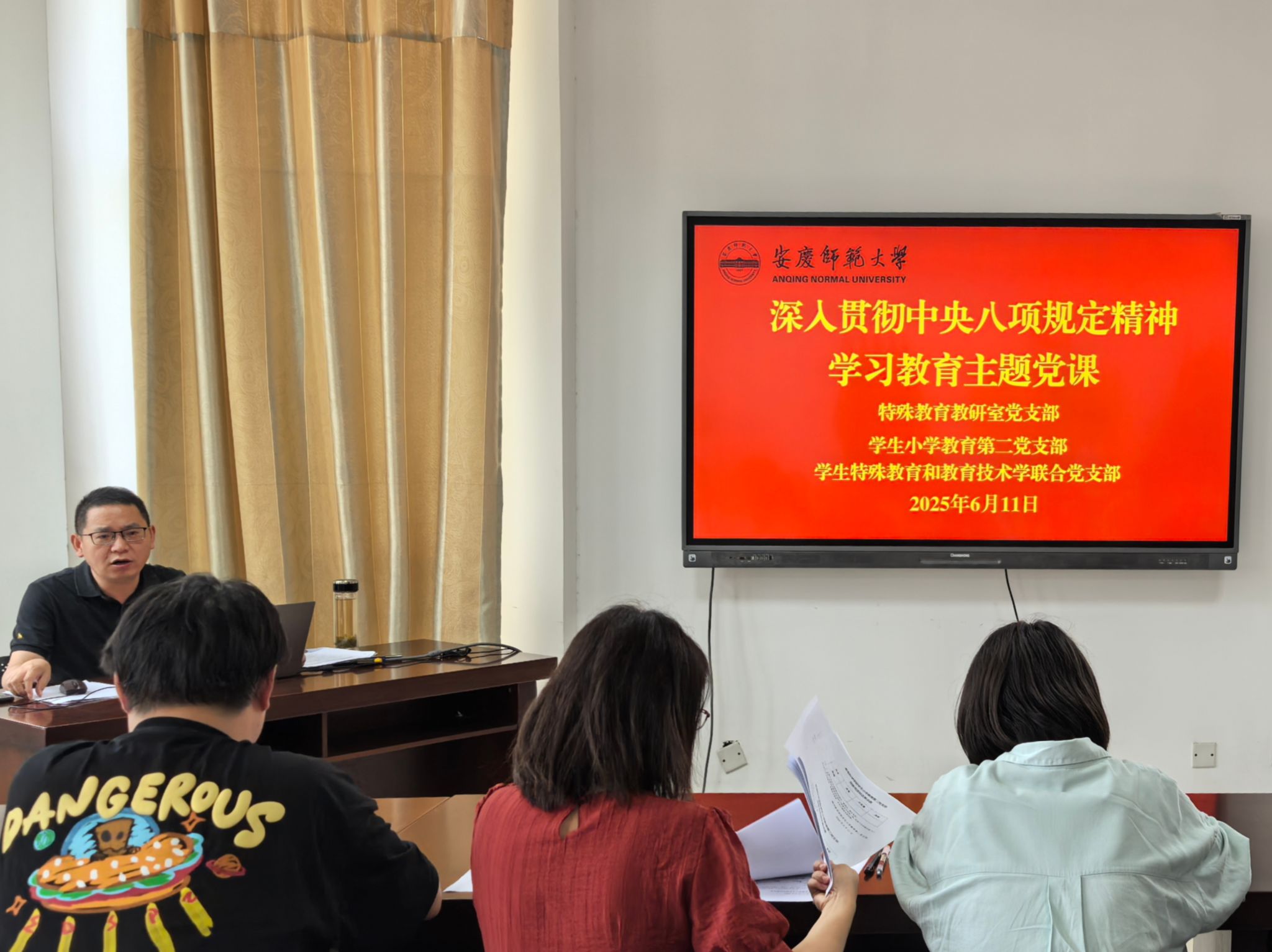 6月11日,beat365在线唯一官网登录党委书记何孔蛟在J202会议室为特殊教育教研室党支部、学生小学教育第二党支部、学生特殊教育和教育技术学联合党支部党员讲授深入贯彻中央八项规定精神学习教育专题党课。