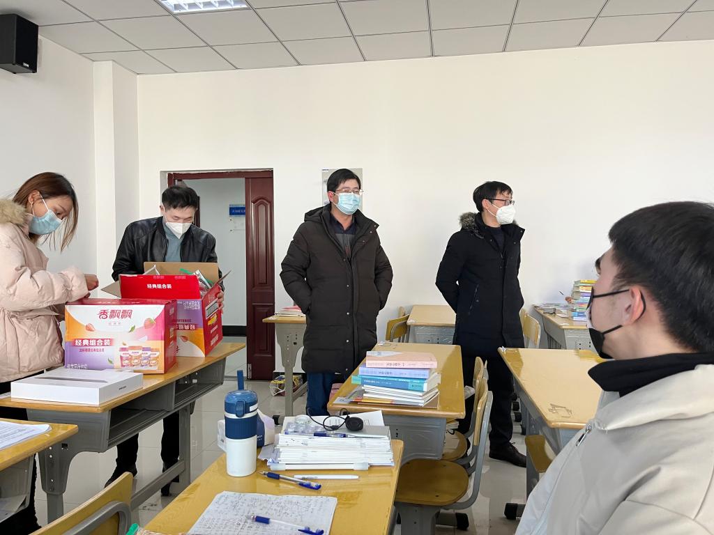 陈志超询问了学生近期学习和生活情况,为同学们答疑解惑,同时就当下寒冷天气如何做好考研规划和调节好心理状态做了针对性的引导。许世平强调,一要坚定考研信心;二要做好时间管理;三要调整好心态和生物钟;四要注意自身安全,无论在校内还是校外住宿考研的同学,一定要做好疫情防控防范,保护好自己的人身、财产安全。辅导员老师为备考学生发放了精心准备的慰问品。