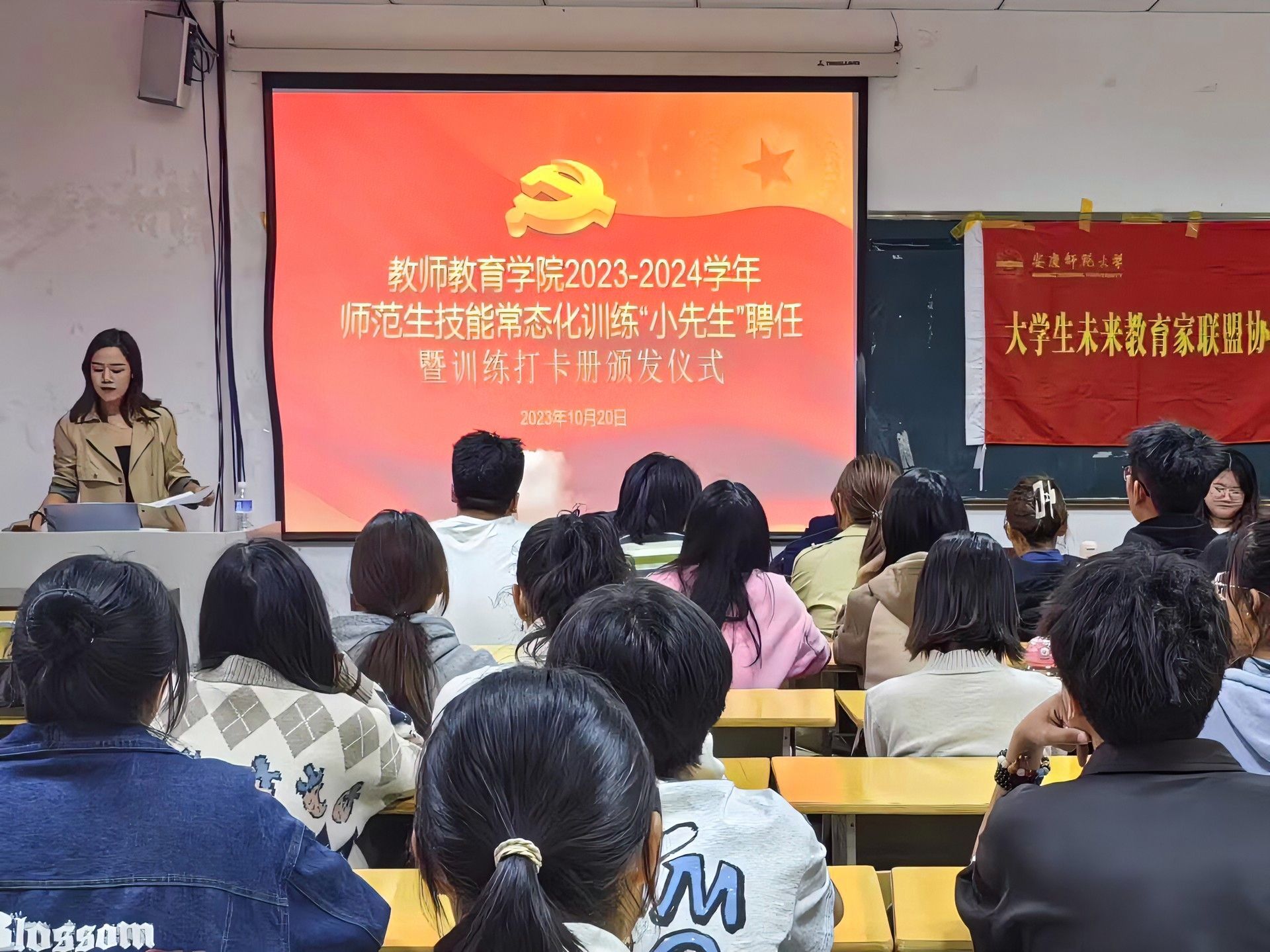 10月20日,beat365在J305开展2023-2024学年师范生技能常态化训练“小先生”聘任以及训练打卡册颁发仪式。院党委副书记许世平,新生辅导员汪悦、汪洋洋,2023级新生代表,20余名新聘“小先生”到场参加,本次活动由团学负责老师姚强诚主持。
