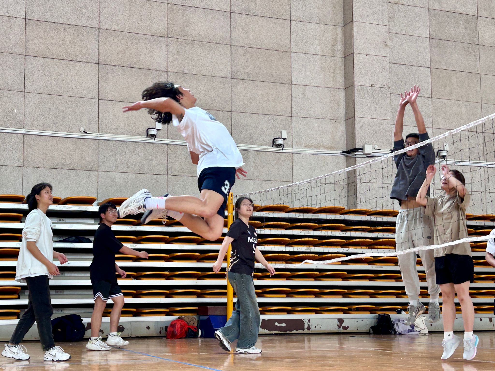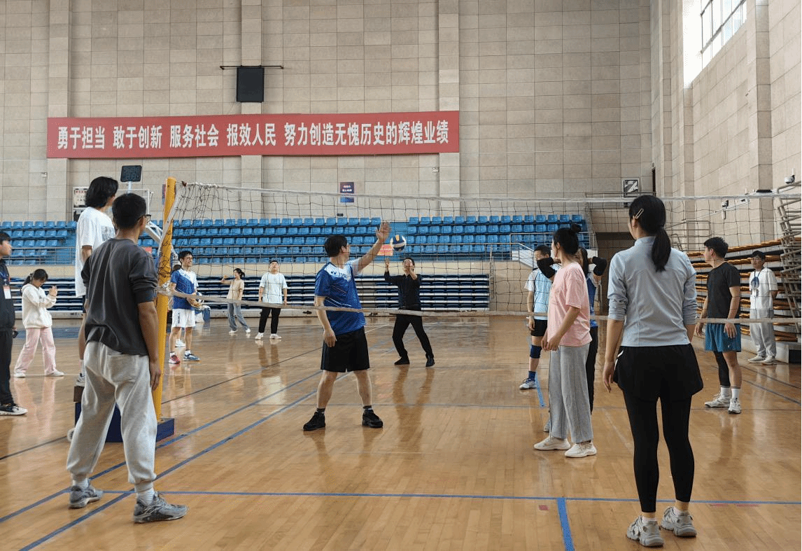 伴随一声哨响,比赛在学院党委书记何孔蛟的第一发球中拉开序幕。赛场上,全体师生各个激情饱满,发球、拦球、起跳、扣杀……充分发挥个人技术的同时也不忘团队配合,接球传球扣杀,拦网阻击补位,过渡衔接保护,整体攻防有序。教职工和学生珠联璧合,迅猛的发球、巧妙的拦网、精准的扣杀,使得比赛高潮不断。赛场加油助威声此起彼伏,攻防快速转换,呈现一场场精彩对决,诠释了奋勇拼搏的运动精神。