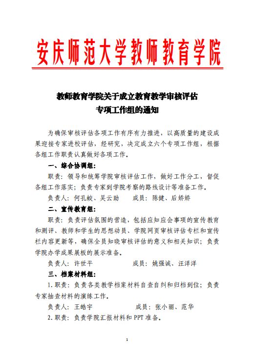 教师教育学院关于成立教育教学审核评估专项工作组的通知
