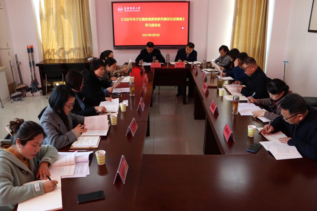 49日,安庆师范大学教师教育学院组织安庆家庭教育研究指导中心部分研究人员召开《习近平关于注重家庭家教家风建设论述摘编》学习座谈会,安庆市妇联主席焦玲、副主席张莉、我校“女生工作坊”负责人陈银凤应邀出席会议。安庆教育研究指导中心理事会成员和学术委员会委员参加会议,会议还邀请了安庆市委党校、安庆市家庭教育讲师团部分教师参加会议。